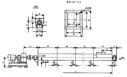 LS型螺旋輸送機等效采用ISO1050-75標準,設計制造符合ZBJ81005.1~2-88《 LS螺旋輸送機》**標準。LS型螺旋輸送機直徑由100mm~1250mm,共十二種規(guī)格,分為單驅動和雙驅動兩種形式,單驅動螺旋機長度可達40m(特大型30m),雙驅動螺旋機采用中間斷開軸結構,長度可達80m(特大型60m),螺旋機長度每 0.5m 一檔,可根據需要選定,螺旋機頭部軸承、尾部軸承置于殼體外部減少了灰塵對軸承室的侵入提高了螺旋機關鍵件的使用壽命。中間吊軸承采用滾動、滑動可互換的兩種結構,阻力小、密封性強、耐磨性好?;瑒虞S承的軸瓦有粉末冶金、尼龍和巴氏合金等多種材料供用戶根據不同的場合選用。吊軸承機外側置式油杯,便于集中加油潤滑。進出料口位置布置靈活,并增設電動型出料口,便于自動控制,還可根據用戶要求,配置測速報警裝置。