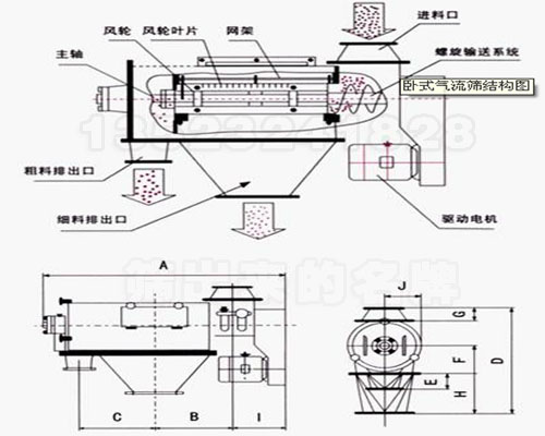 臥式氣流篩分機(jī)篩網(wǎng)為圓筒狀,置于機(jī)體內(nèi),物料通過螺旋輸送系統(tǒng)后,和氣流混合、霧化進(jìn)入網(wǎng)筒內(nèi);通過網(wǎng)筒內(nèi)風(fēng)輪葉片使物料同時受離心力和旋風(fēng)推進(jìn)力,從而近使物料噴射過網(wǎng),由細(xì)料排出口排出,不能過網(wǎng)的物料沿網(wǎng)筒壁從粗料排出口排出。